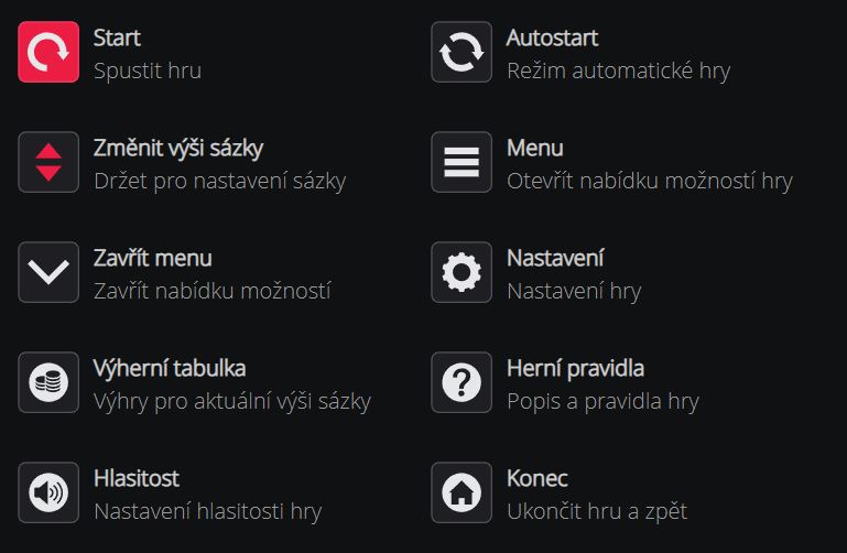 Přesné hodnoty (výplatní tabulka) najdete v informační obrazovce hry – liší se dle casina/verze.